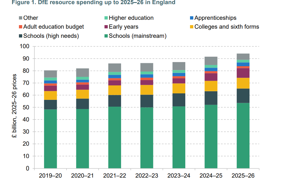 The IFS Report states that “In 2023-4, total public spending on education in the UK stood at £116Billion [including the net cost of issuing student loans and in 2024-5 prices]. This represents an 11% or nearly £15Billion fall since 2010-11 and represents the level in real terms as in 2006-7. This drop mostly reflects the shift in the cost of higher education from the taxpayer to graduates over time.”
