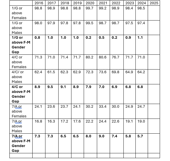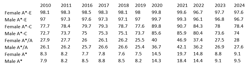 - There were significant problems around examinations in 2020, 2021 and 2022. Grades improved significantly when examinations were cancelled in 2020 and 2021 but have returned to their pre-pandemic levels by 2024