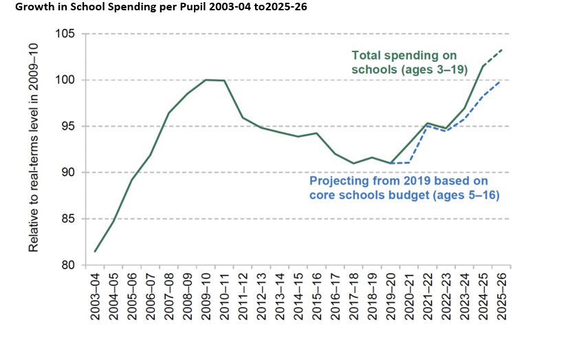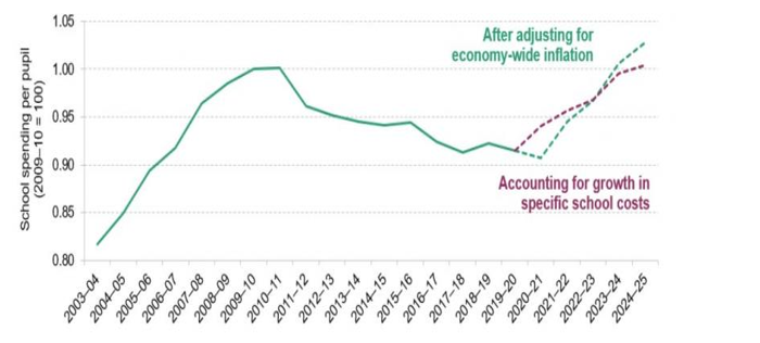 - The IFS has estimated that by 2024-25 once the effects of increases in school costs were taken account of total funding per pupil was lower than when adjusted to take account of economy wide inflation. When account is taken of school cost increases it is estimated that by 2024/25 total school spending per pupil returned to its 2009-10 level.