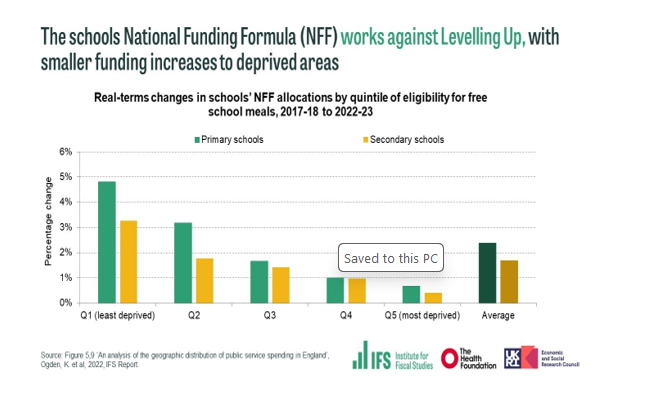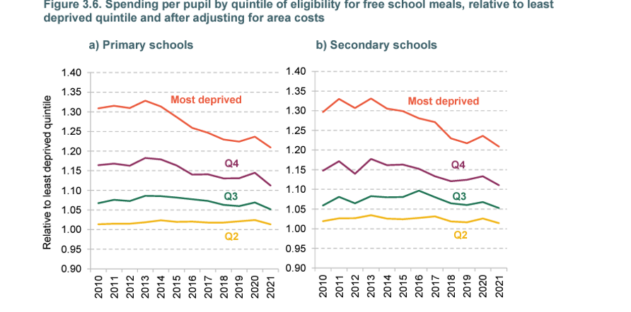 - Between 2009/10 and 2019/20 the reductions to education spending per pupil which have occurred have fallen more on the schools with the most deprived pupils [14%] than on schools with the least deprived pupils [9%].