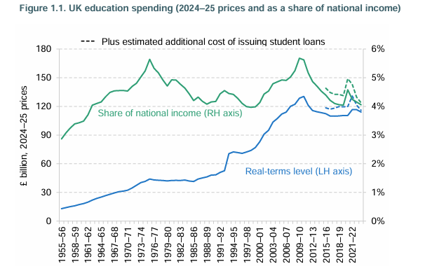 “Education spending has also fallen as a share of national income from about 5.6% of national income in 2010-11 down to about 4.1% in 2023-24. This equals recent historic lows seen in the late 1990s, late 1980s and mid-1960s. There has been no long-run increase in the share of national income devoted to public spending on education spending despite large increases in education participation in the long run.”